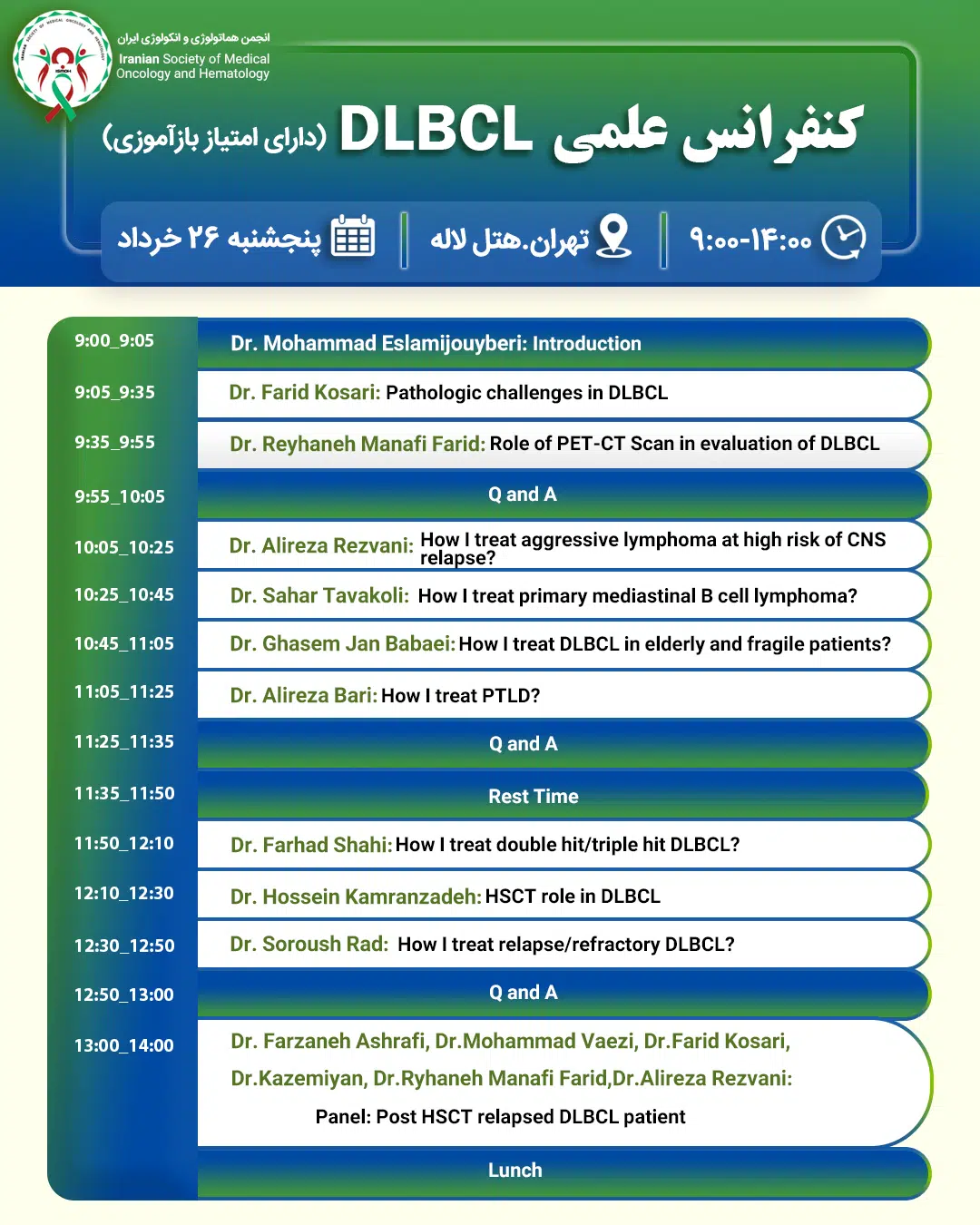 کنفرانس علمی Diffuse Large B-Cell Lymphoma توسط انجمن هماتولوژی و مدیکال انکولوژی ایران در تاریخ 1401/3/26 در هتل لاله تهران برگزار می گردد.