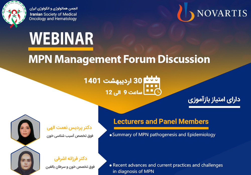وبینار (MPN Management Forum Discussion) با همکاری شرکت نوارتیس و انجمن هماتولوژی و مدیکال انکولوژی ایران در تاریخ 1401/2/30 برگزار می گردد.