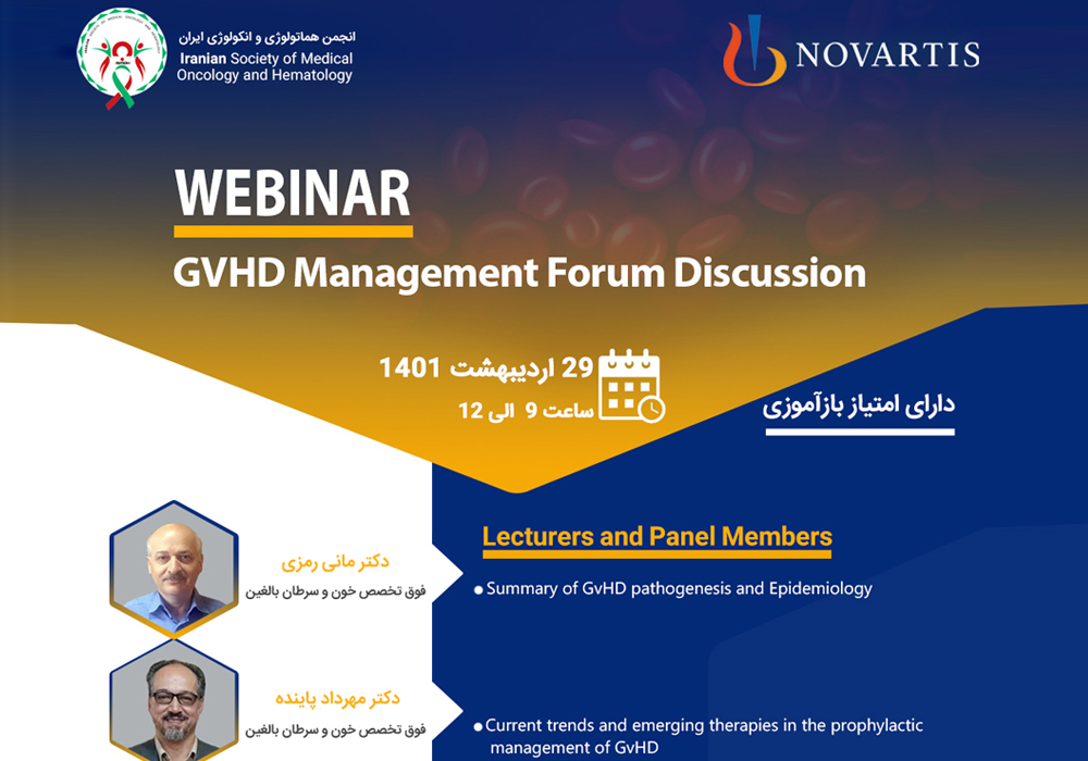 وبینار (GVHD Management Forum Discussion) با همکاری شرکت نوارتیس و انجمن هماتولوژی و مدیکال انکولوژی ایران در تاریخ 1401/2/29 برگزار می گردد.